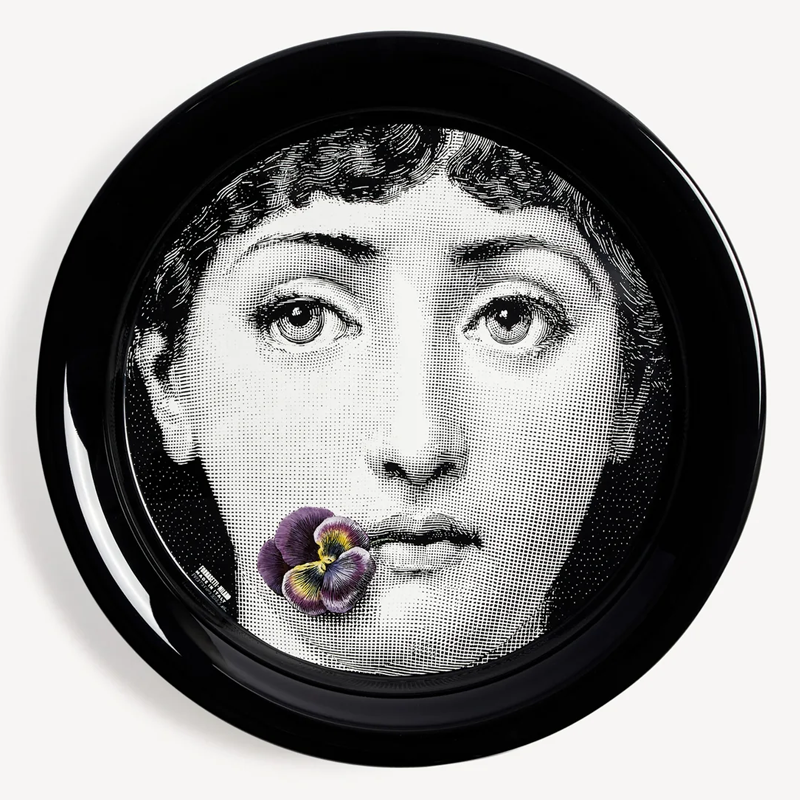 The circular shape and flat surface of Fornasetti trays beautifully highlight the features of opera singer Lina Cavalieri, the iconic figure at the heart of the Atelier’s visual universe. This metal tray from the Tema e Variazioni series is enriched with a hand-painted colored detail by the Atelier’s painters. Paired with the folding stand, the tray can be transformed into a small table.