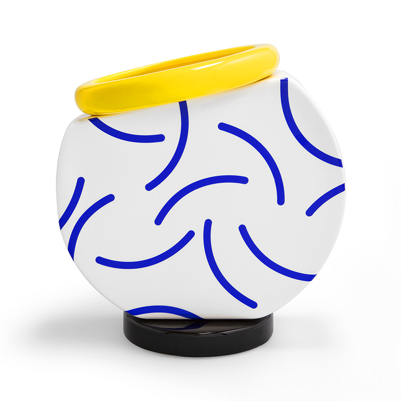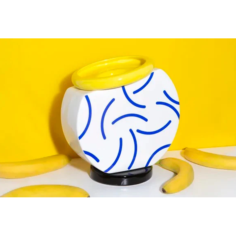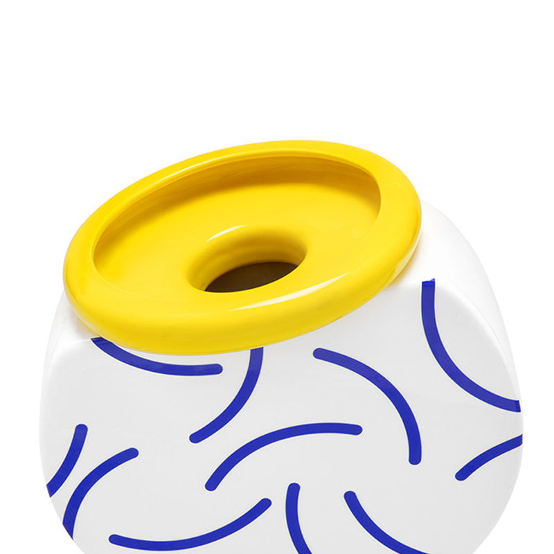Cucumber is an eccentric ceramic vase designed by Martine Bedin in 1985. Its bulbous, asymmetrical, and dynamic shape is enhanced by a vivid color combination and an original decorative pattern featuring blue curvilinear motifs that animate the white surface. The rounded form, reminiscent of a cucumber, rests on a black cylindrical base and is diagonally cut at the top by a bright yellow ring.