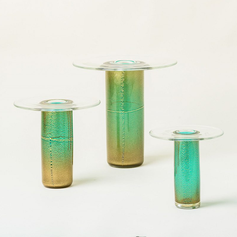 Peter Marino designs for VENINI a series of cylindrical vases crowned with a sculptural plate, joined in the furnace using the incalmo technique. Entirely handcrafted, they combine the purity of crystal with the depth of colored glass — including a version enriched with delicate layers of gold leaf that progressively expand under the glassblower’s mastery. The collection is available in three sizes, each expressing a different balance of proportions and presence.