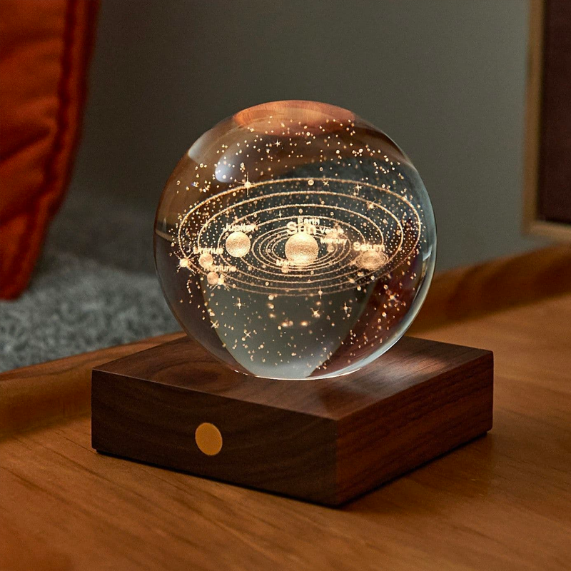 Un semplice oggetto che vuole aggiungere un tocco di magia e meraviglia al tuo spazio. La sfera di vetro è appoggiata su una base in legno di noce con led integrato e il disegno è inciso al laser in modo tridimensionale al suo interno