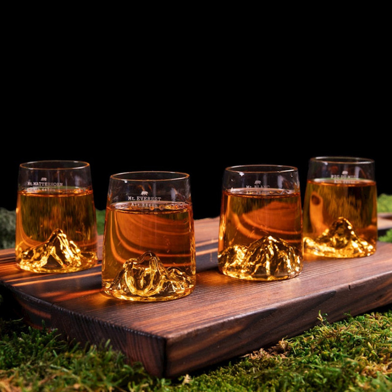 The Box of 4 Shooters Topographic features four shot glasses with intricate topographic designs of iconic mountains: Pic du Midi, Matterhorn, Everest, and Mont Blanc, making it a must-have for adventure and mountain enthusiasts.