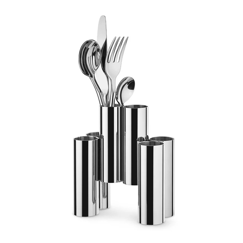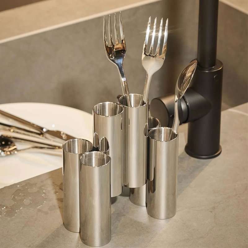 Patricia Urquiola presents the Canale cutlery holder that demolishes the limits of classic table settings, moving the cutlery to a single point in the center of the table, where everyone can reach them. This paves a new way, a focal point that becomes a communication channel, stimulating sharing and dialog. An highly theatrical object made of straight tubes that vibrate with reflected light, celebrating a new contemporary ritual.