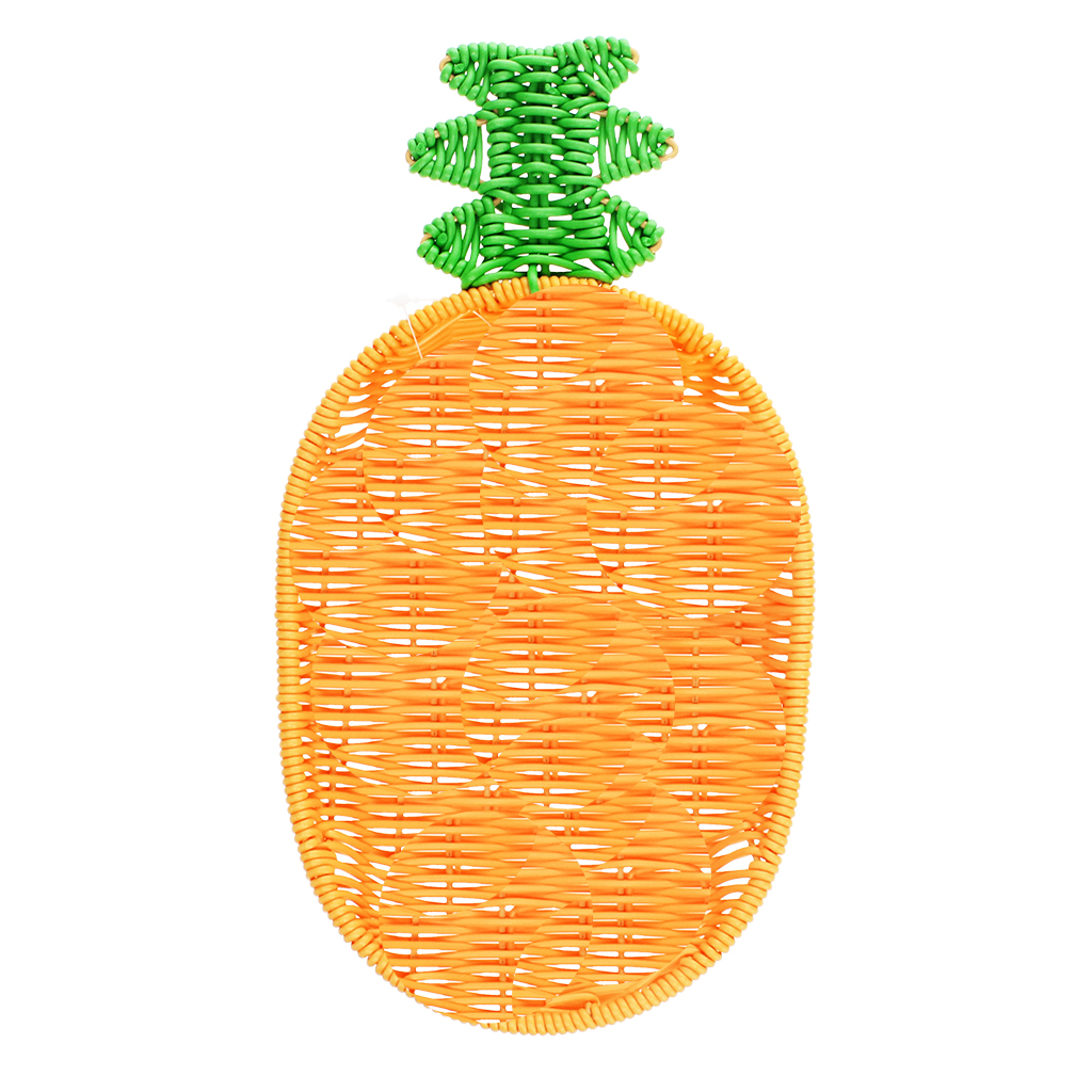 Fun and handy basket, constructed from food-safe plastic, woven around a sturdy metal frame. Featuring a fruity and summery pineapple design, with vibrant orange and green colours and details, it provides a playful and stylish way of storing fruits, snacks, or other household items. Perfect for placing on a shelf, kitchen worktop, or at the centre of a dining table.