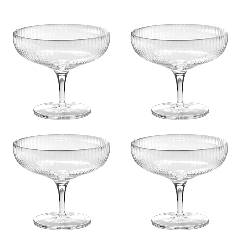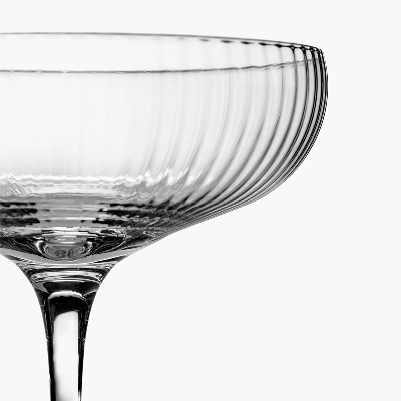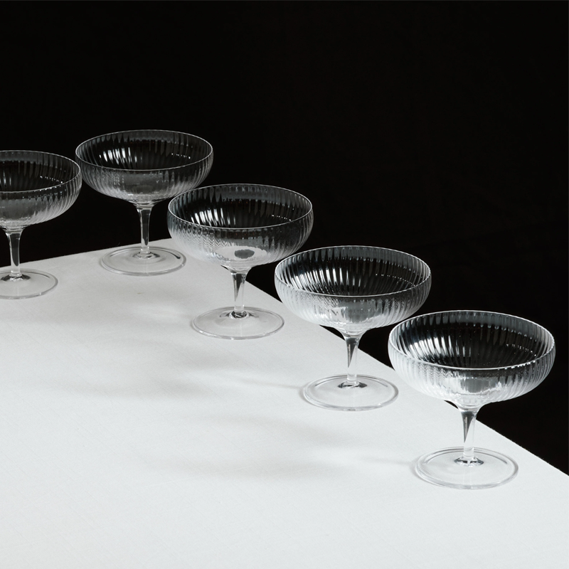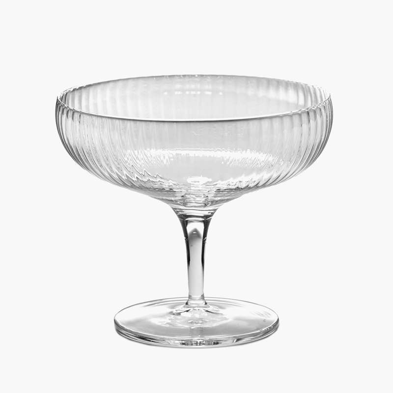 Glass coupe suitable for sparkling wines and small dishes. These glasses have a timeless design and are transparent.