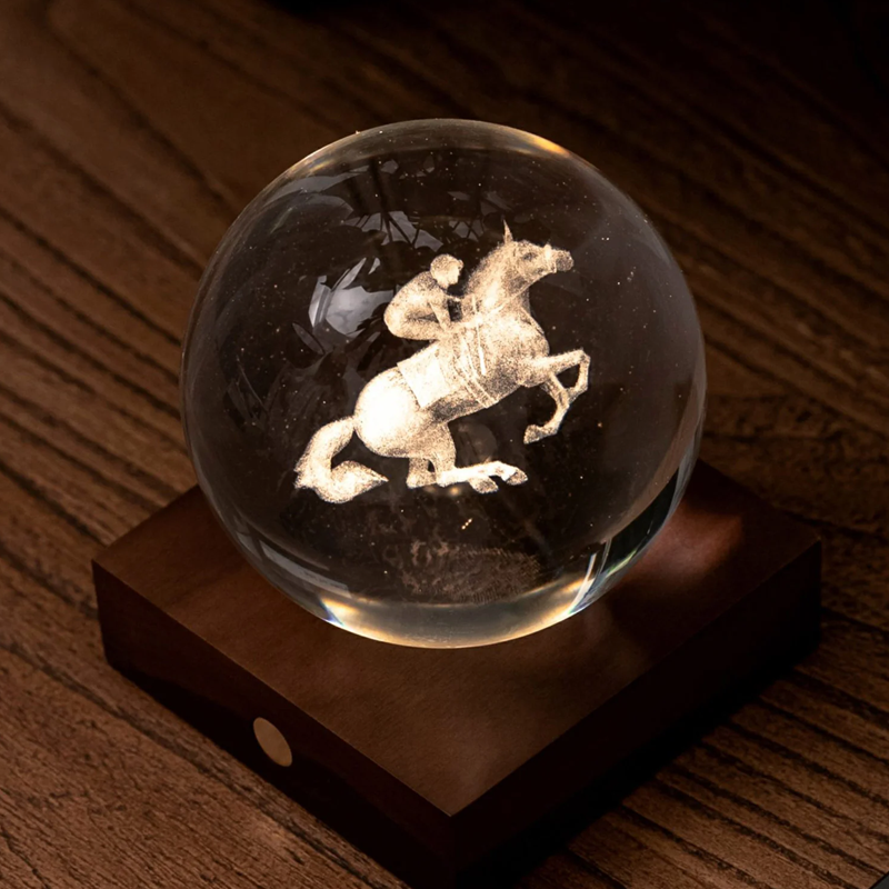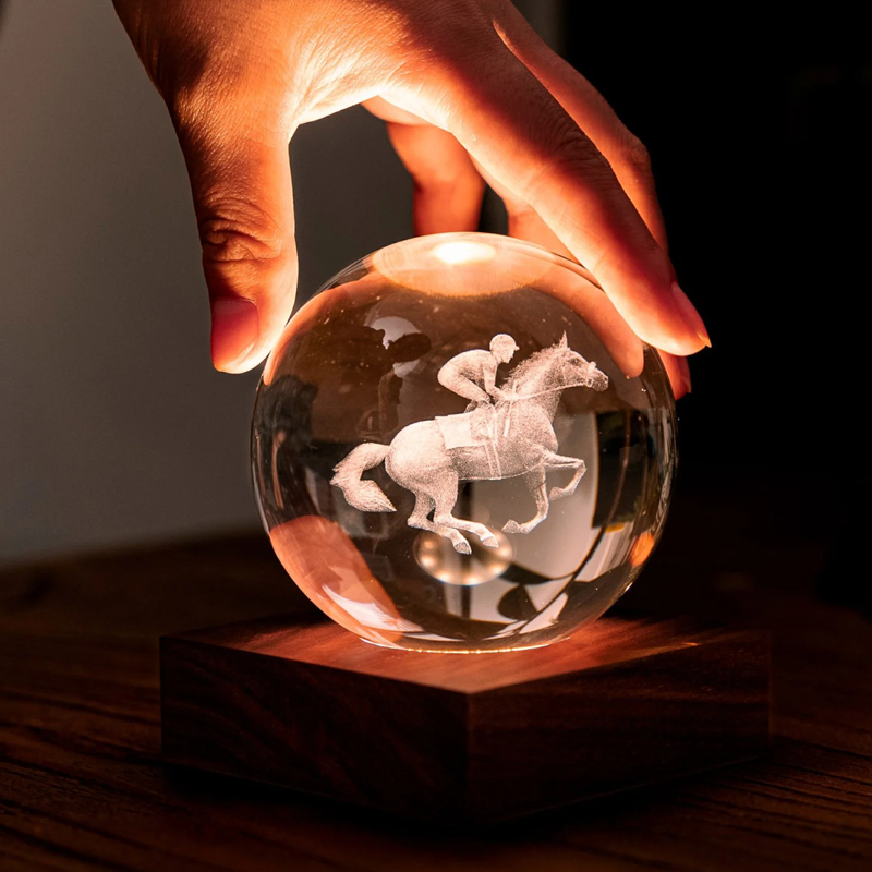 The glass sphere rests on a walnut wood base with an integrated LED, while the design is laser-engraved in three dimensions inside the sphere.