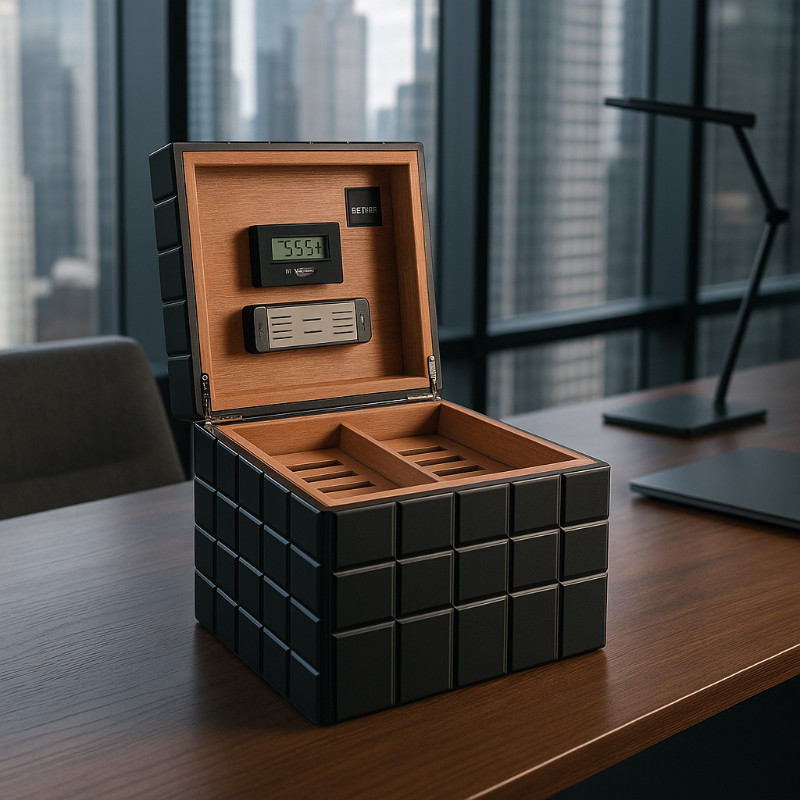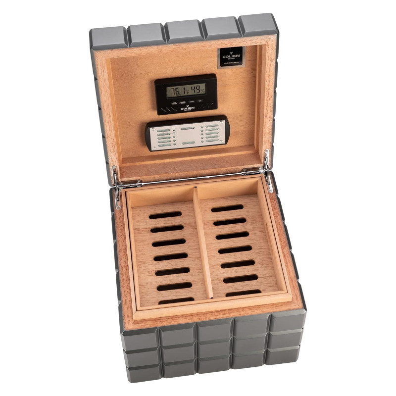Defined by its unique geometric pattern, the Heritage Cube humidor is a sophisticated and stylish way to store and display your cigars, offering enough room for around 40-50 sticks depending on size. Additionally, the Heritage Cube features a digital hygrometer, a magnetic humidification system, a removable tray, and two dividers, making it both practical and fashionable