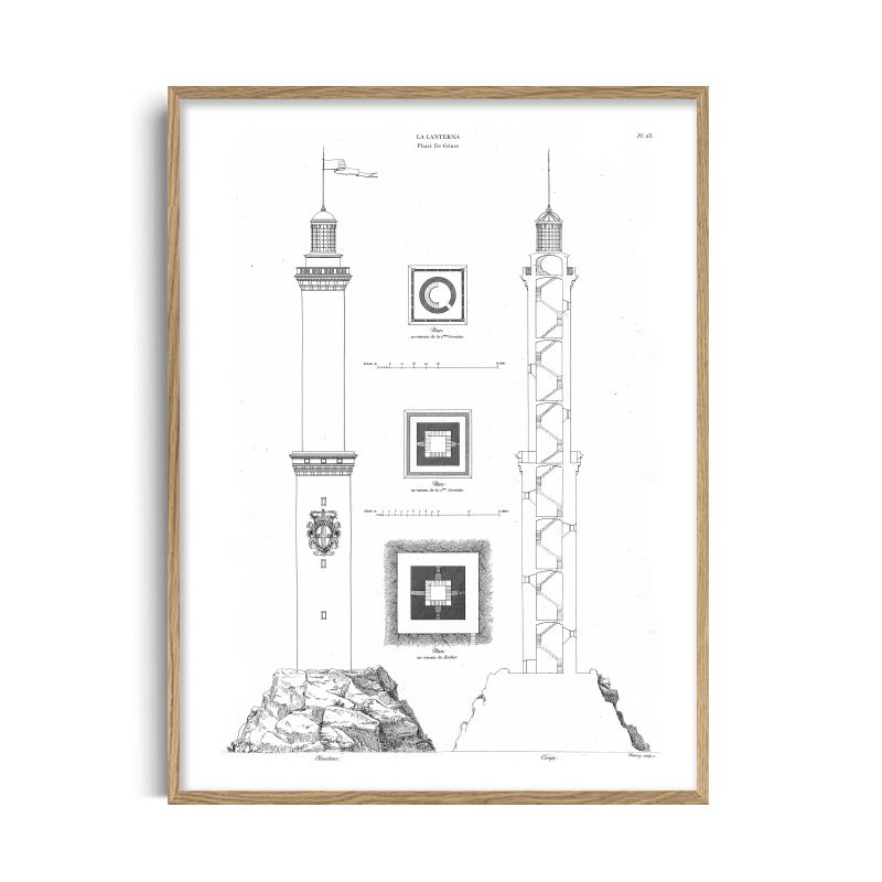 Reproduction of the renowned engraving dedicated to the Lighthouse of Genoa, the city's enduring symbol, taken from the monumental compendium "Les plus beaux édifices d e la ville d e Gênes et de ses environs", the most extensive 19th-century corpus of views, plans, elevations, and sections devoted to the city of Genoa, published in Paris by the French architect Martin-Pierre Gauthier in two volumes (1818 and 1832), comprising more than 170 engraved