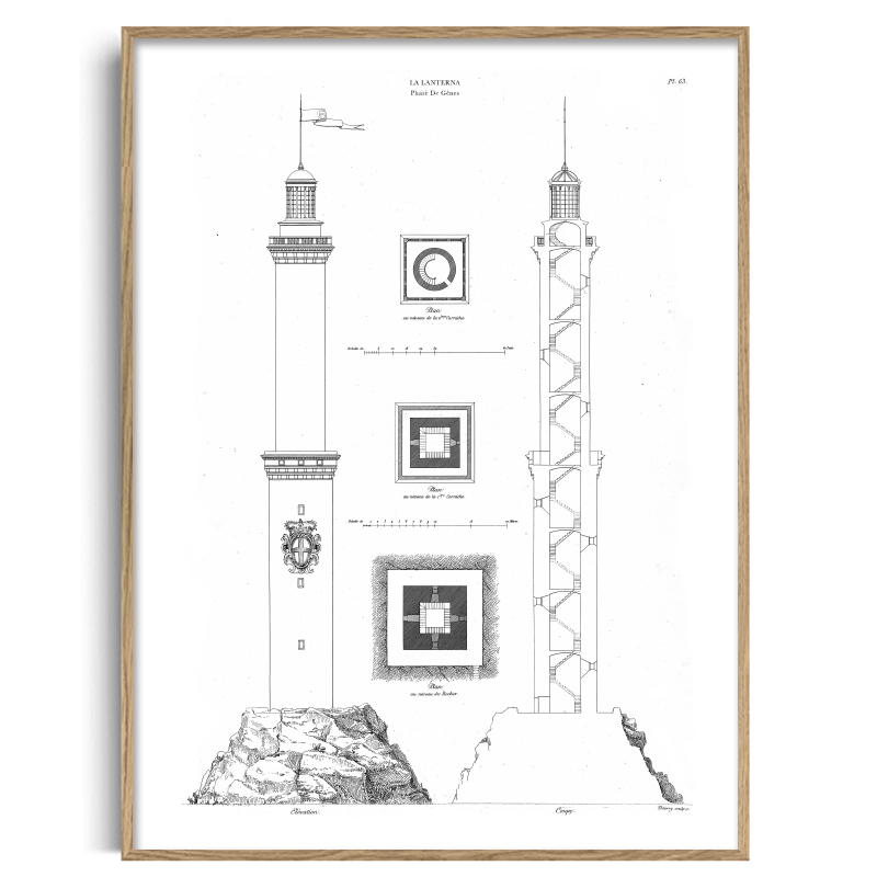 Reproduction of the renowned engraving dedicated to the Lighthouse of Genoa, the city's enduring symbol, taken from the monumental compendium "Les plus beaux édifices d e la ville d e Gênes et de ses environs", the most extensive 19th-century corpus of views, plans, elevations, and sections devoted to the city of Genoa, published in Paris by the French architect Martin-Pierre Gauthier in two volumes (1818 and 1832), comprising more than 170 engraved