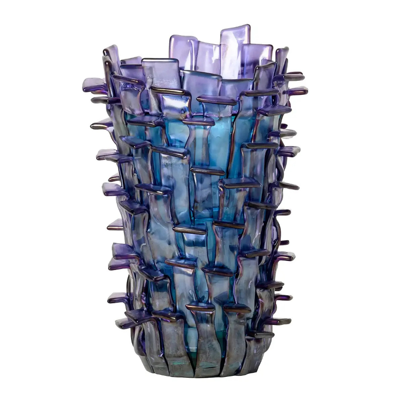 The Ritagli vase is created using a glassmaking technique devised by Fulvio Bianconi, one of the most innovative and evocative of the twentieth century: thin rectangular glass strips are layered one over the other on a truncated cone base, which is mouth-blown and entirely hand-crafted.