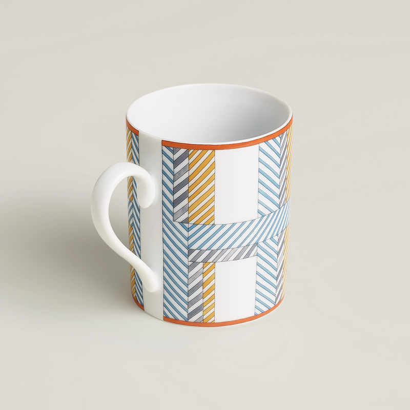 In Hidden H, the letter “H” plays hide-and-seek within a graphic composition of vertical and horizontal lines. Inspired by his work for the Hermès en Contrepoint service, designer Nigel Peake creates a new version with an all-over pattern to decorate mugs featuring watercolor-like shades.