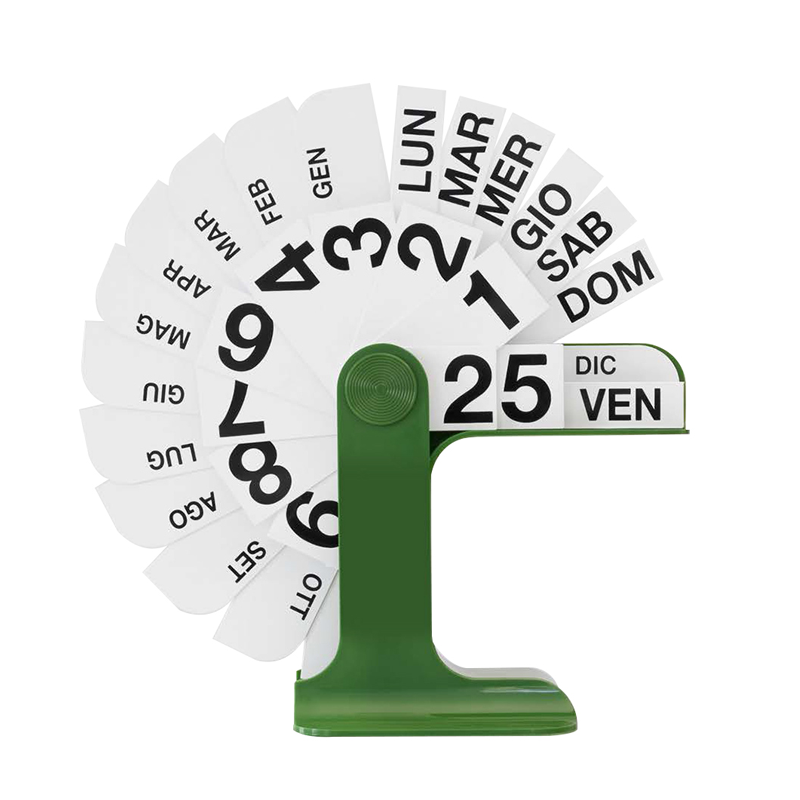 Timor is a perpetual calendar that, thanks to the fan-opening PVC bands, allows you to choose the paddles that identify the month, number and day of the week, fixed to a pin. It has the characteristics of modularity, flexibility, washability, transformability guaranteed by plastic.
