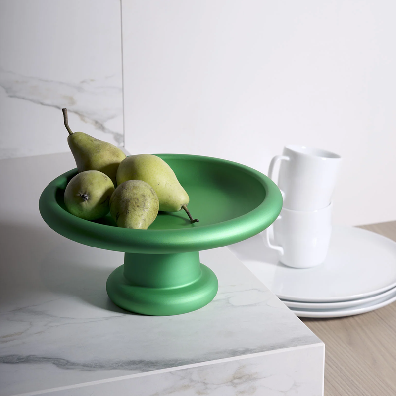 Cake stand with generous rim. Turned aluminium sheet with coloured anodization, green.