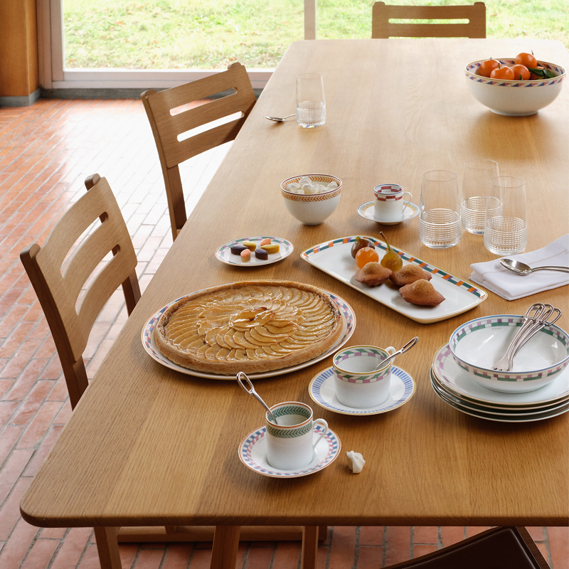 Hermès En Contrepoint punctuates everyday life as well as special occasions with elegance and lightness. Rendered in an extremely delicate kaolin white, the porcelain is enhanced with friezes in soft or vivid hues—pink, violet, blue, green, orange… for a total of around thirty shades. The vibrant geometric motifs, hand-drawn and painted in watercolor by artist Nigel Peake, transport us into a graphic universe of measurements and their repeated fractions, inviting us to create a multitude of combinations. Plates or cups with friezes, minimalist plates or teapots: each creation has its own decorative motif, its own rhythm. A harmonious balance of simplicity and freshness.