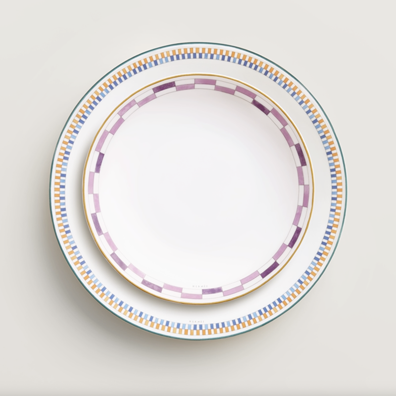 The Hermès En Contrepoint tableware invites you to play with combinations and layering. Colorful motifs adorn the 33 pieces in the set for lunch, dinner, and tea or coffee.