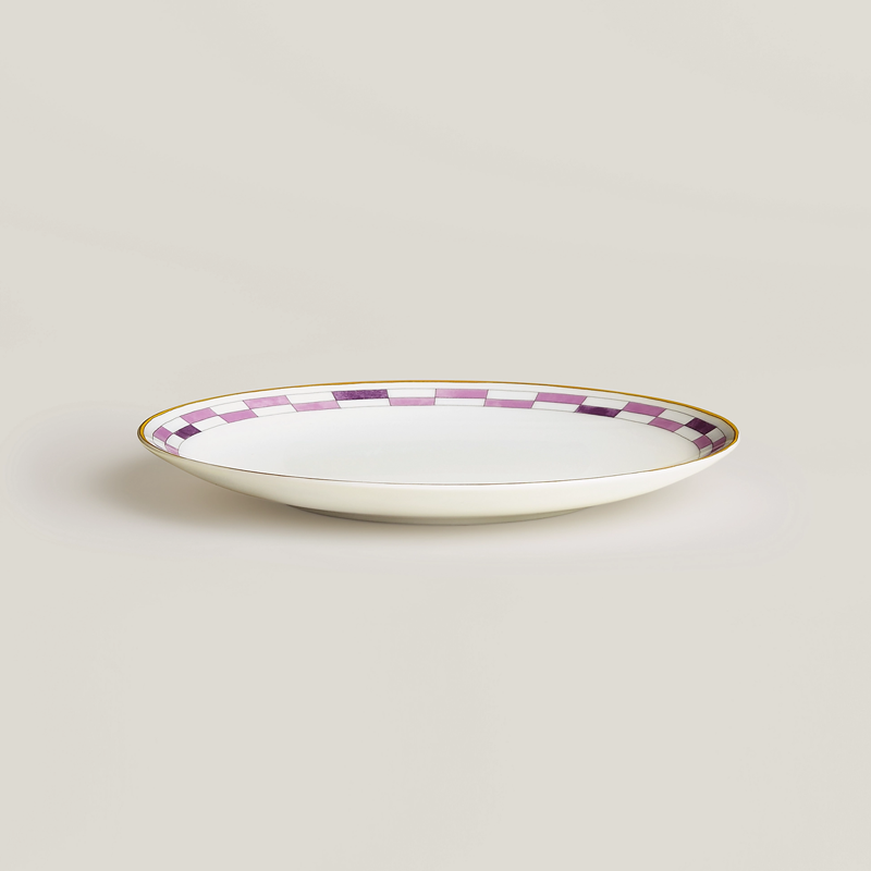Hermès En Contrepoint punctuates everyday life as well as special occasions with elegance and lightness. Rendered in an extremely delicate kaolin white, the porcelain is enhanced with friezes in soft or vivid hues—pink, violet, blue, green, orange… for a total of around thirty shades. The vibrant geometric motifs, hand-drawn and painted in watercolor by artist Nigel Peake, transport us into a graphic universe of measurements and their repeated fractions, inviting us to create a multitude of combinations. Plates or cups with friezes, minimalist plates or teapots: each creation has its own decorative motif, its own rhythm. A harmonious balance of simplicity and freshness.