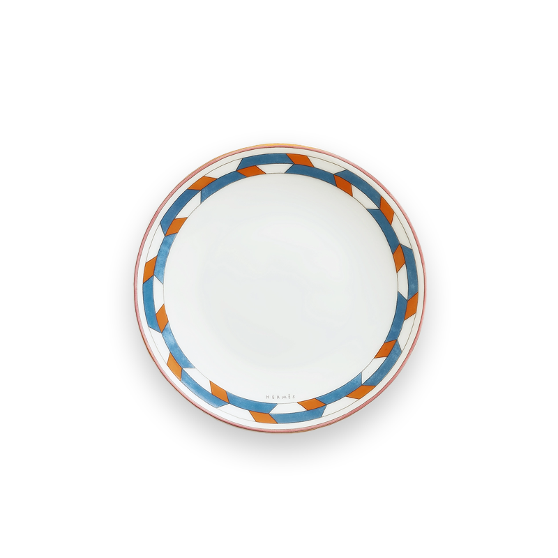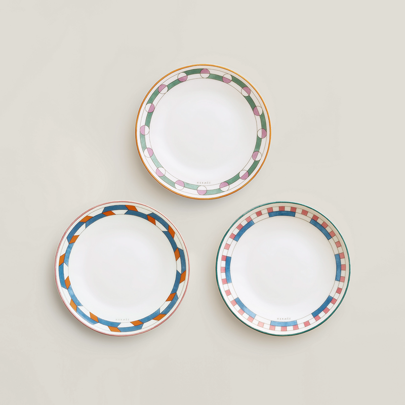 The Hermès En Contrepoint tableware invites you to play with combinations and layering. Colorful motifs adorn the 33 pieces in the set for lunch, dinner, and tea or coffee.