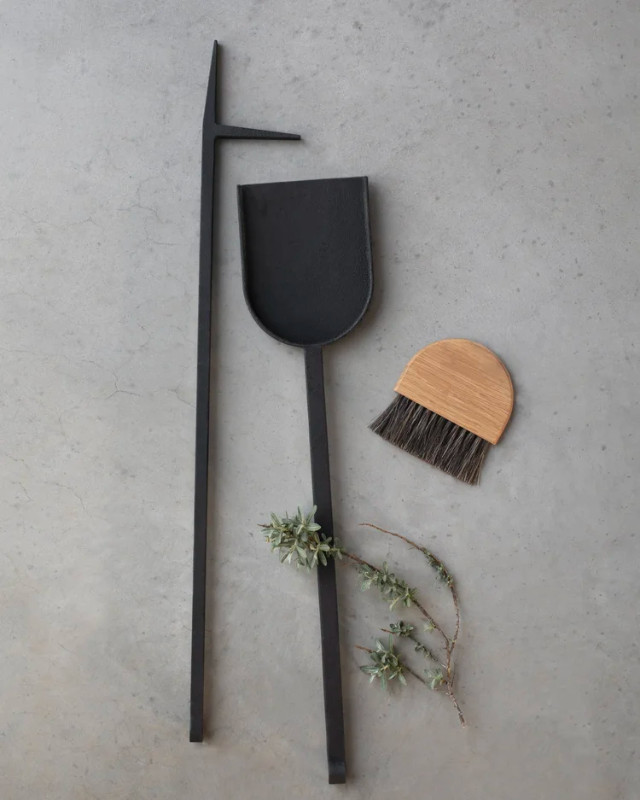 The set includes a shovel, a poker, and a handcrafted brush made of oak wood and horsehair. The poker is always kept in position thanks to a magnet integrated into the base, ensuring stability and order when not in use.