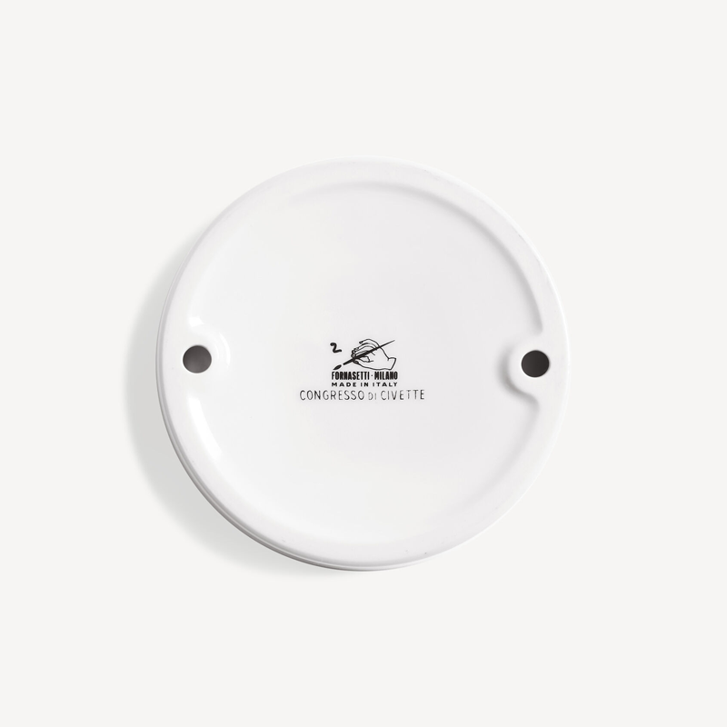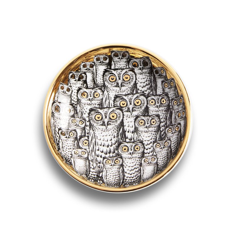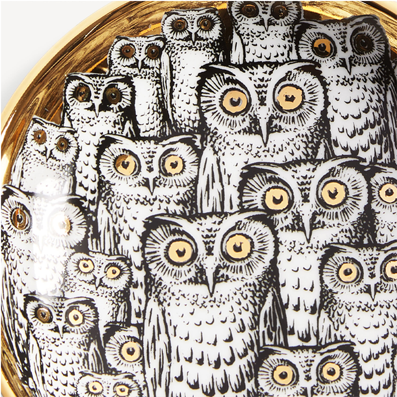 Animal symbol of wisdom and foresight, the little owl has always sparked Fornasetti’s imagination: here it takes center stage in the decoration of this porcelain ashtray, hand-decorated with gold details.