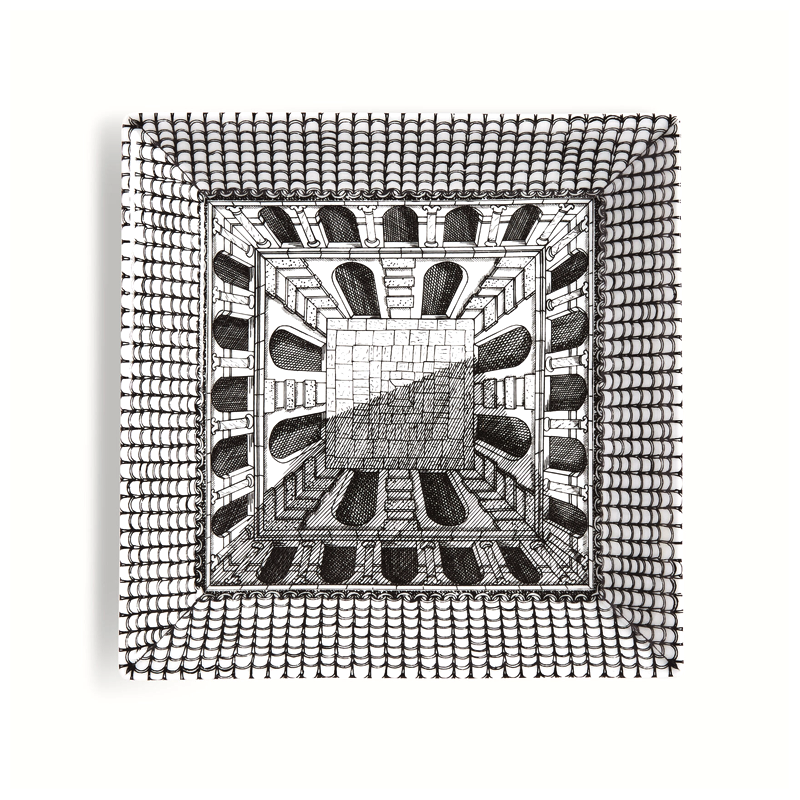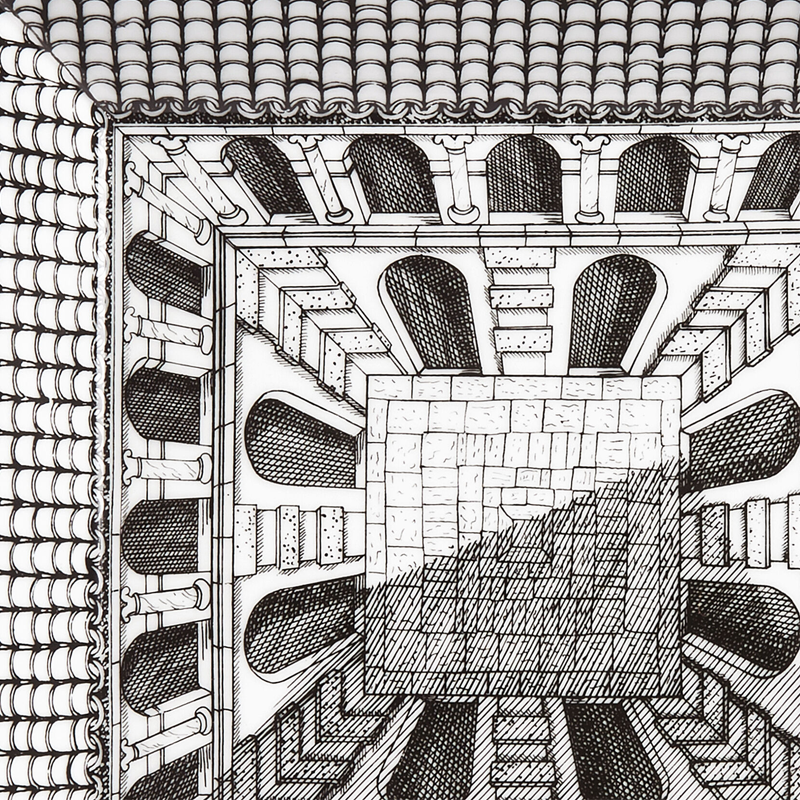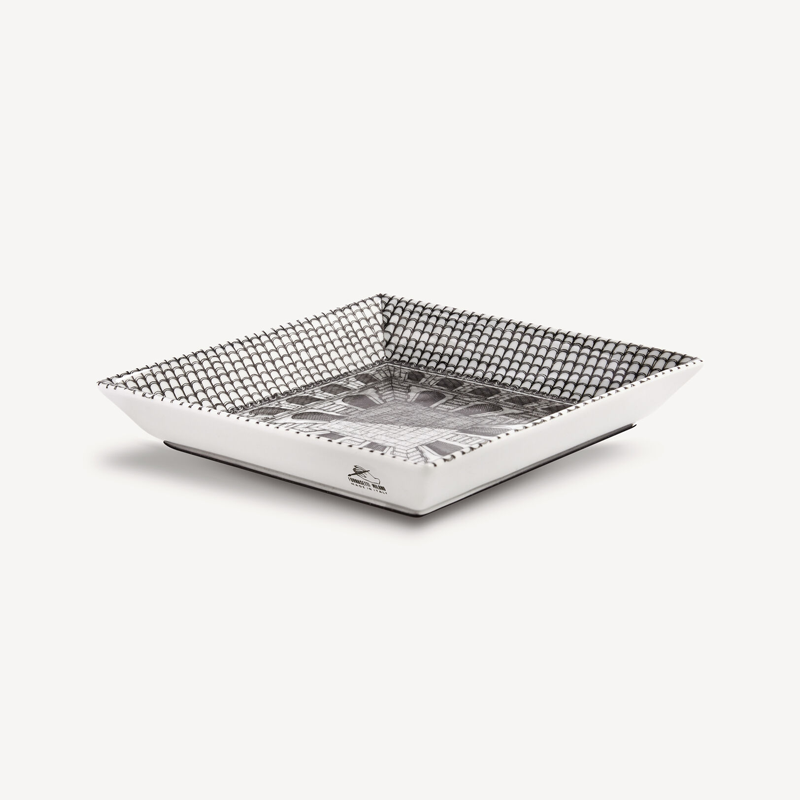 Fornasetti loved incorporating architecture into his decorations, as evidenced by this square-shaped, hand-decorated porcelain vide-poche. A functional yet decorative piece, ideal as a catchall or as a pure design accent.