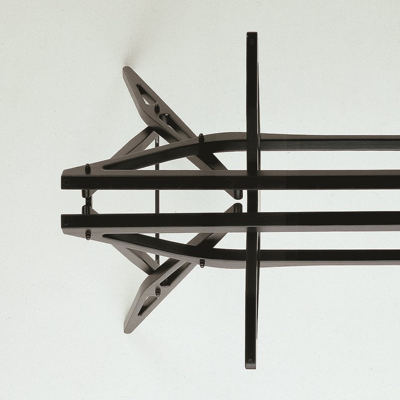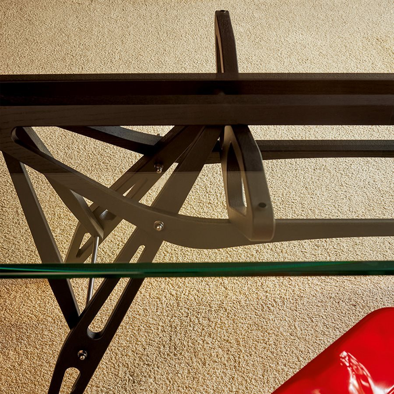The masterful use of construction techniques is clearly visible in the trestle structure and in the interplay of joints and tie rods employed to support a wide range of glass tops.