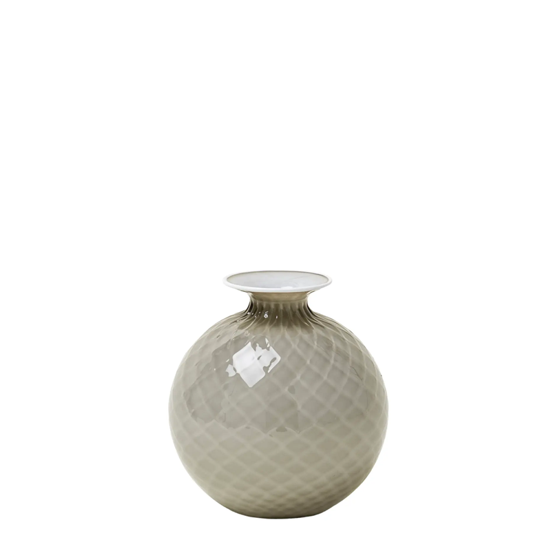Sembra morbido, eppure è vetro. L'illusione ottica del Monofiori di VENINI del 1970 è nel suo nome: Balloton, la lavorazione unica che ricrea sulla superficie l'effetto matelassé. L'opera è lavorata a mano, soffiata nel caratteristico stampo in metallo e finita nel collo sottile con un filo colorato applicato a caldo, che varia nel colore.