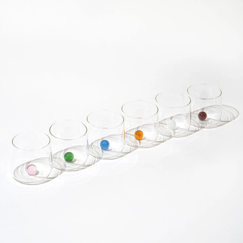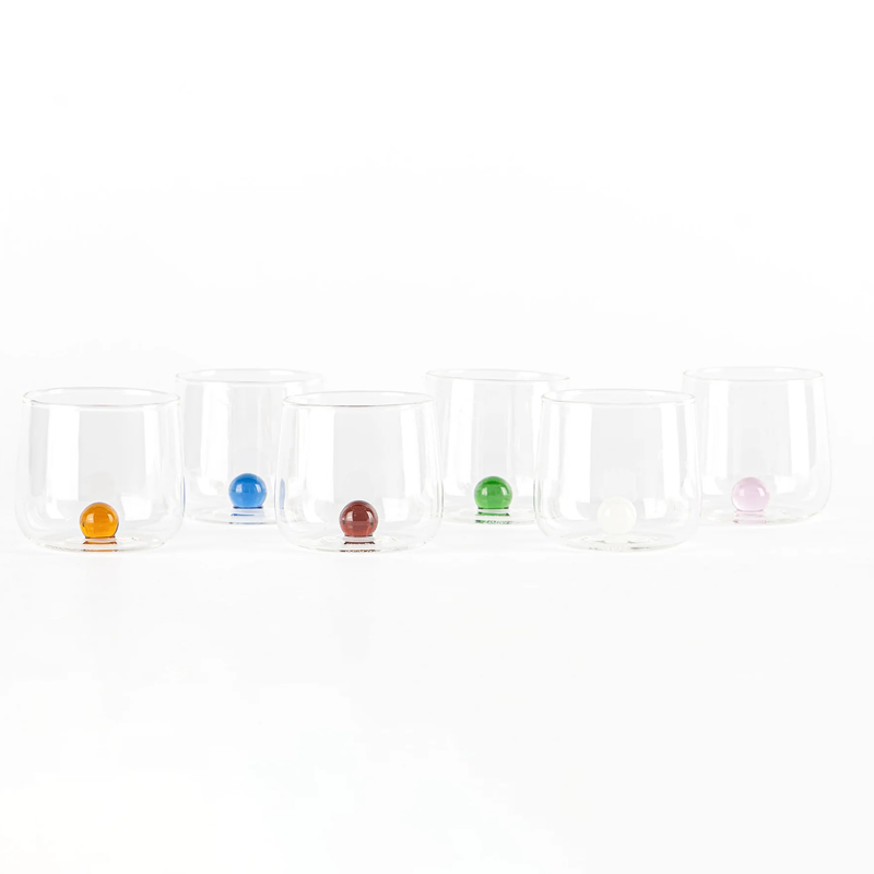Bilia nasce da un'idea del designer veneziano Federico De Majo, fondatore del marchio Zafferano. Questo set è composto da 6 bicchieri Junior Tumbler ideali per liquori in vetro borosilicato con un marmo all'interno, che ricorda i bicchieri con cui abbiamo giocato da bambini, in diverse colorazioni: verde, ambra, giallo oro, bianco, blu e rosa. Il borosilicato è un vetro sintetico leggero, molto resistente agli shock termici ed è adatto anche per l'uso quotidiano. Le collezioni Zafferano sono soffiate a bocca e realizzate a mano. Bilia è un nuovo concetto di bicchiere con una linea originale, unica, adatta per una mise en place elegante e con un impatto estetico impressionante. In ogni bicchiere si trova una vera pallina di vetro di diverso colore. Lavabile in lavastoviglie.