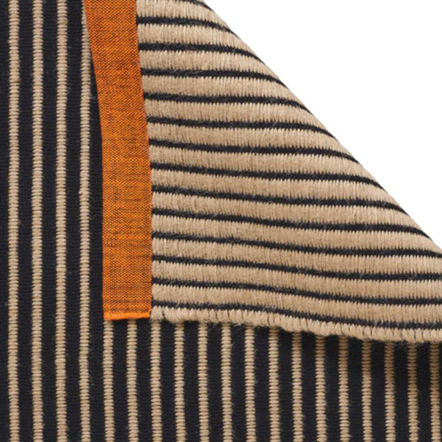 Line Rug by Tom Dixon is crafted with a reversible mixed yarn flat weave that combines practicality with visual appeal. The design emphasizes versatility, making it suitable for various interiors.