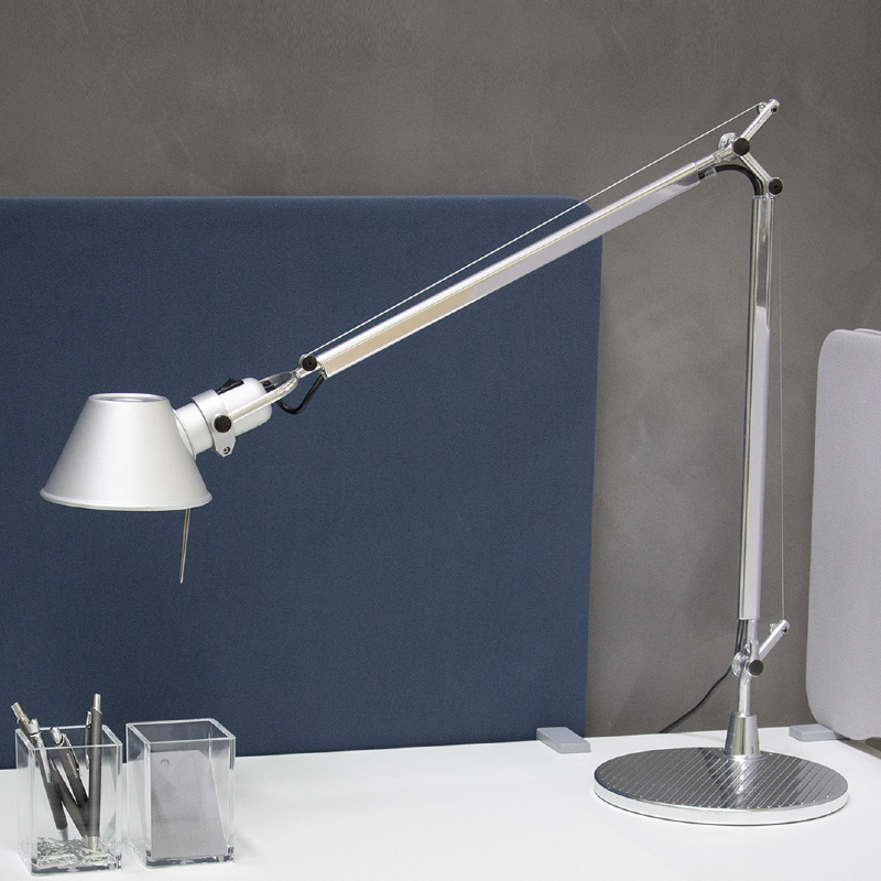 Cantilevered structure in polished aluminum; fully rotational diffuser in matt and supports in polished aluminum. System of spring balancing. Available in four versions, each with an interchangeable support in polished aluminum.