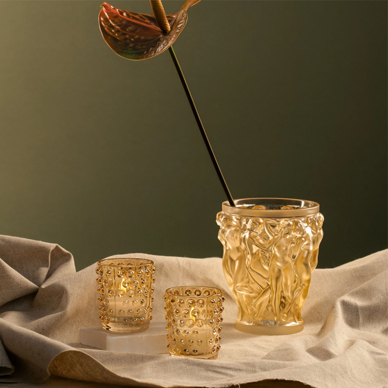 Kaleidoscope effect, creative genius, technical prowess, the Mossi votive is an ideal, a perfect synthesis of modernity in fine arts. Originally created by René Lalique in 1933 in clear glass, this emblematic piece is today reinterpreted in the votiveand transfigured through gold luster crystal, sparkling and hypnotic.