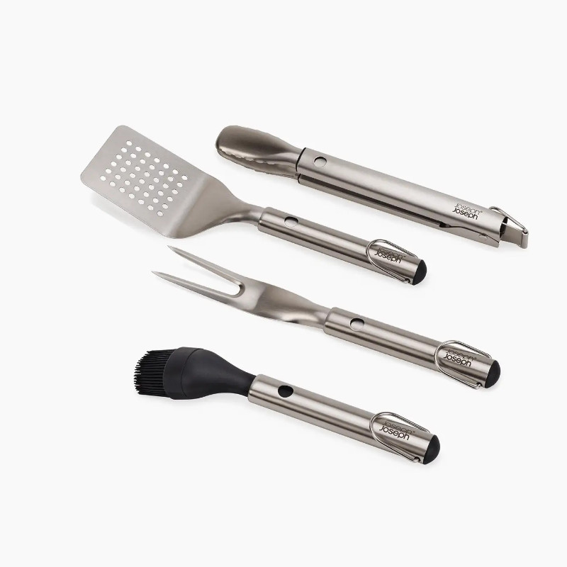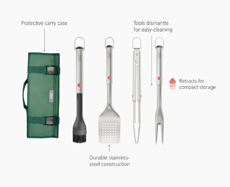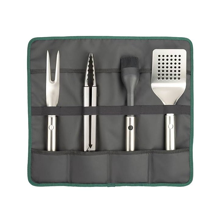 Complete your grill setup with this 4-piece utensil set, featuring a basting brush, tongs, turner, and fork, plus a foldable case for secure storage and easy transport.