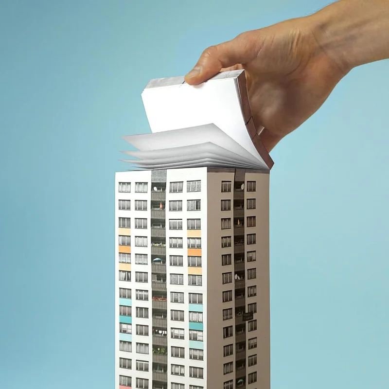 This panel building block is a tribute to the panel buildings of the 70s and 80s. Everyone knows them. For one, the greatest building fears in mankind, for the others an icon of architecture. But one thing is undisputed, there is no better template for our paper scrapers! The cuboid is the origin form of many well-known architectural forms. And these high-rise buildings, skyscrapers, brutalist concrete blocks and now iconic panel buildings are the templates for our notepads! Free from original buildings, the first edition of the paper scraper presents three models of these typical designs in scale 1:250.