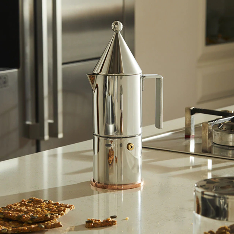 La conica, primo progetto di caffettiera espresso dell'architetto Aldo Rossi, nasce da un gioco di forme geometriche semplici che formano una mini architettura da tavola, dallo stile conciso ed elegante. Icona intramontabile, La conica ha il corpo in acciaio inossidabile e il fondo in rame: un oggetto ricercato, dalle essenziali linee geometriche che danno vita a uno strumento funzionale con il quale preparare e servire il caffè.