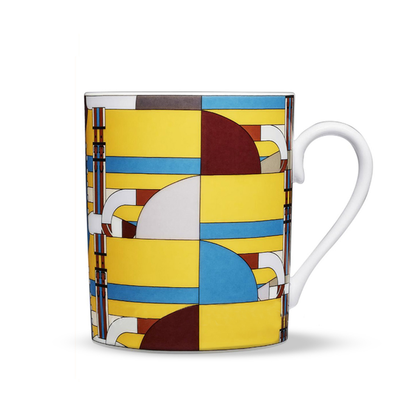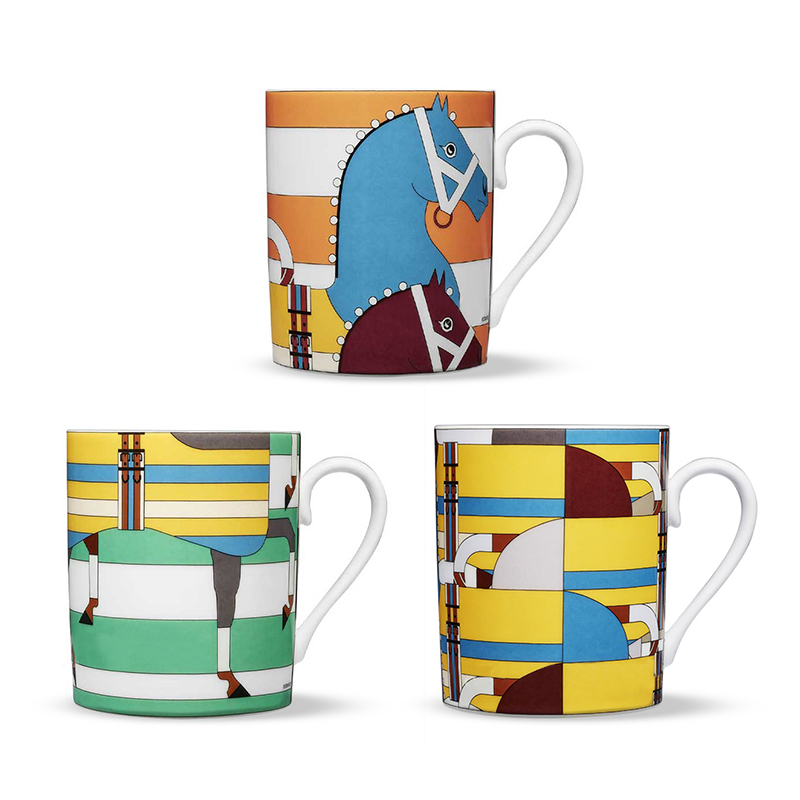 Unveiled for the first time in 1986 on a printed scarf, it has since been reprised on several different articles, especially silk accessories. Now, the design appears on porcelain for the very first time. A joyful group of horses winds its way around three mugs for this limited collection with colorful, graphic lines.