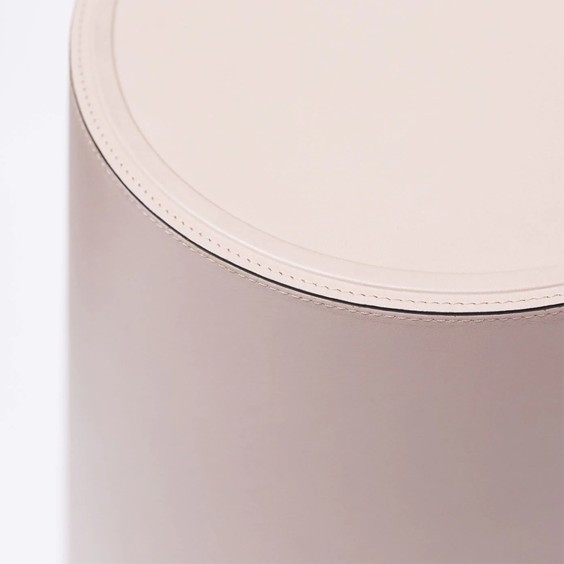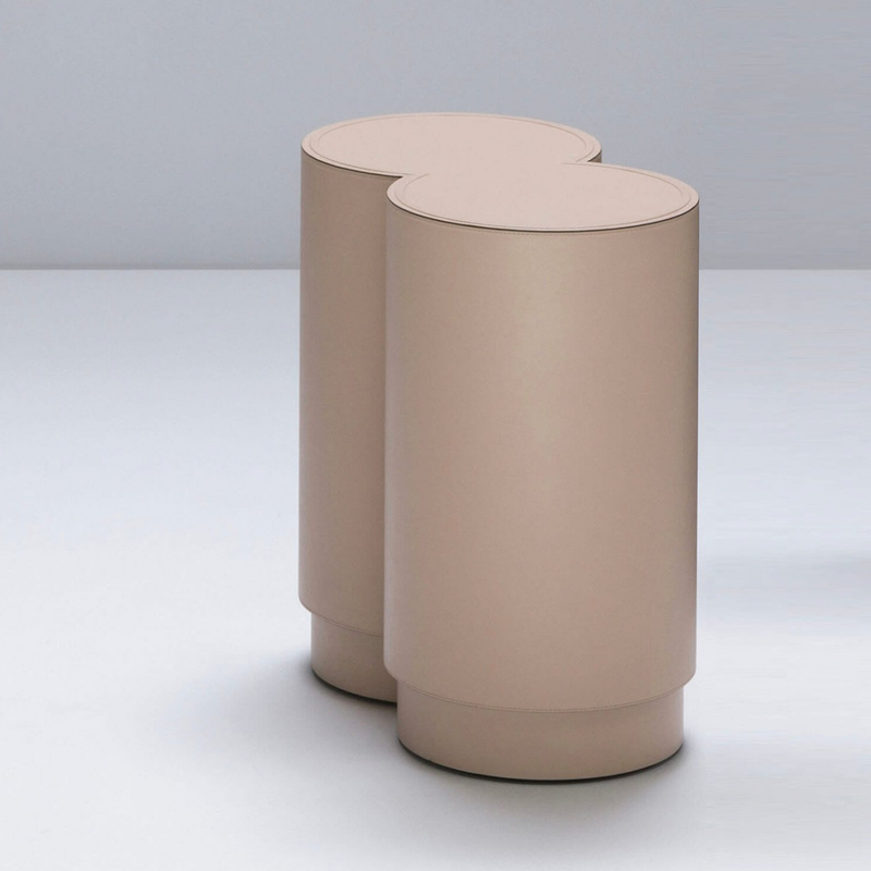 forme essenziali e con richiami art deco per questo sgabello con struttura in legno completamente rivestita in pelle. Un bordo a rilievo ne impreziosisce la sommità .