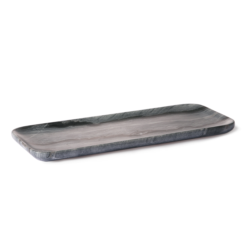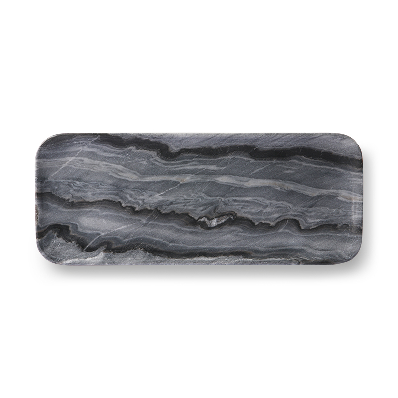Lussuoso vassoio in marmo grigio scuro variegato.