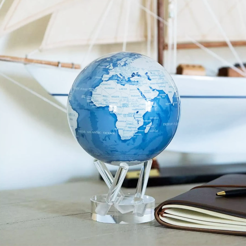 Questo elegante mappamondo mostra la mappa delle costellazioni impresse su fondo nero. Il supporto che sostiene la sfera è in plexiglass ma la cosa davvero interessante riguarda il globo che, grazie ad un particolare sistema magnetico e di celle solari nascoste, ruota in maniera costante e perpetua senza la necessita di cavi o batterie ma esclusivamente grazie alla luce naturale dell'ambiente in cui è posizionato, il guscio esterno, in acrilico trasparente, resta fermo.