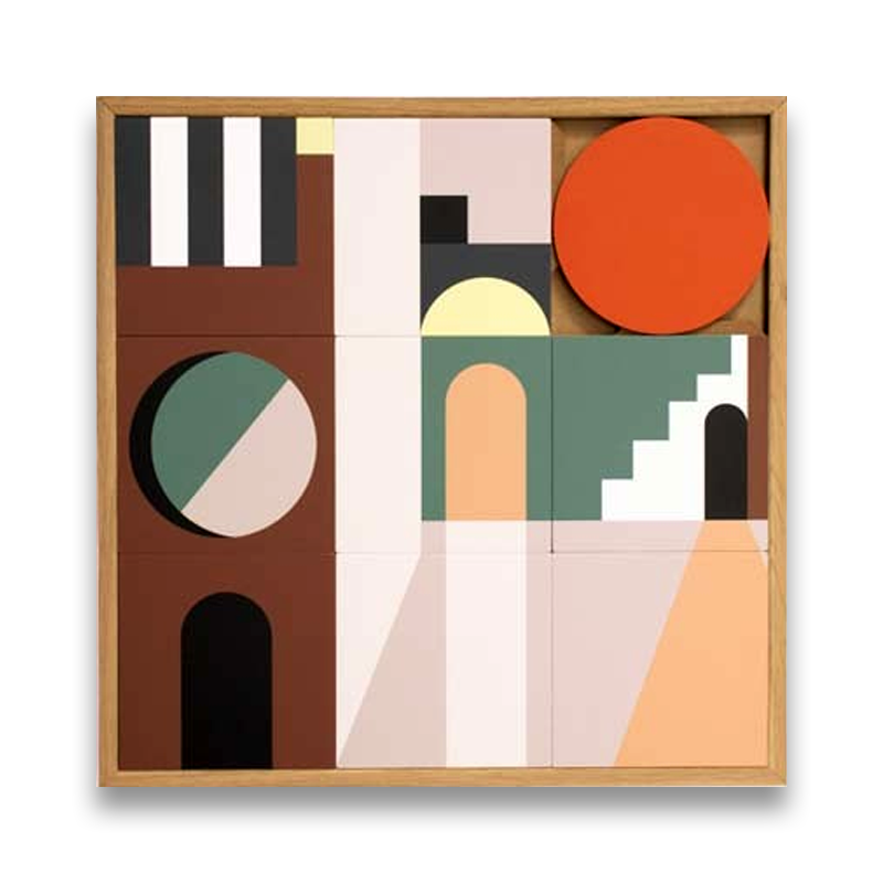 Opera murale decorativa in legno con cornice in rovere massello, una composizione grafica di vari frammenti che contrappongono colori pop a tonalità più delicate.
